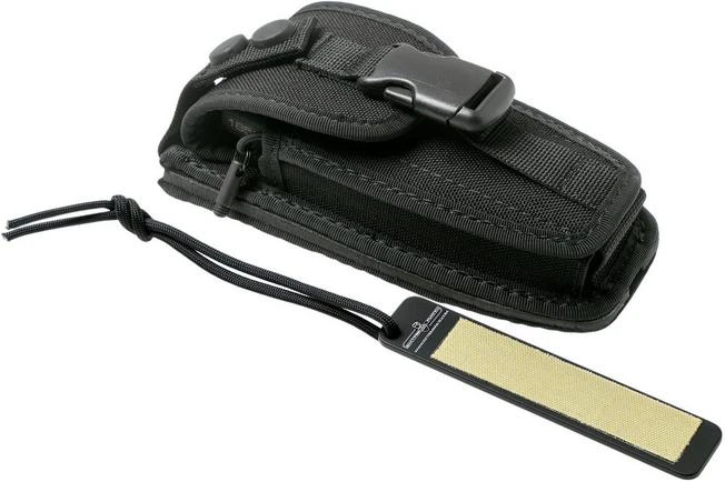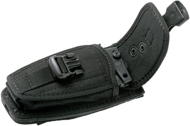 The blade opening and closing are acting with both the hands together to minimize the risk of self-injuries. The extra safe device is a steel pin to be hand screwed through two holes placed by the guard zone of the massive anticorodal aluminium alloy handle. This device is necessary because of the violence of the chopping performances expressed this uncommon folder. The sheath is an essential part of the system. It contains a diamond sharpener and allows the user to carry the knife in open condition, held by a two clip provided lace or in close condition inside the front pocket. The sheath can be hanged to the last generating combat jacket or standard belts thanks to M.O.L.L.E. system.