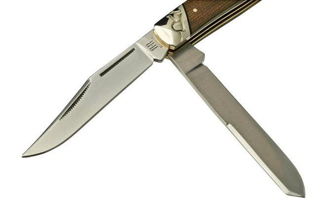 The Rough Ryder Trapper is a cool, traditional pocket knife. A real trapper with a clippoint and a speypoint. You open this knife with two hands and a slipjoint prevents accidental closing. As such you can legally carry this pocket knife in many places in Europe.